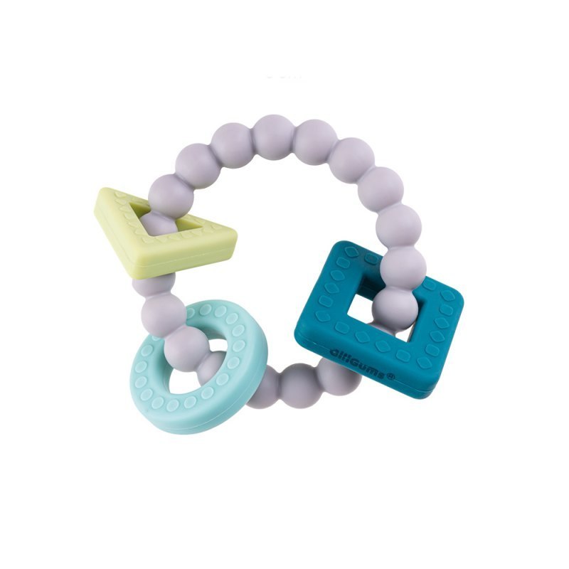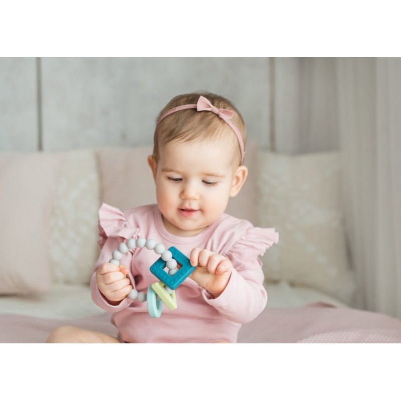 Stylowy, silikonowy gryzaczek – bransoletka z trzema zawieszkami w kształcie figur geometrycznych. Każda z zawieszek posiada inny kolor i fakturę. Zdobią je wypustki, które delikatnie masują dziąsła dziecka, przynoszą mu ulgę w ząbkowaniu. Gryzaczek jest miękki i odporny na zgniatanie.