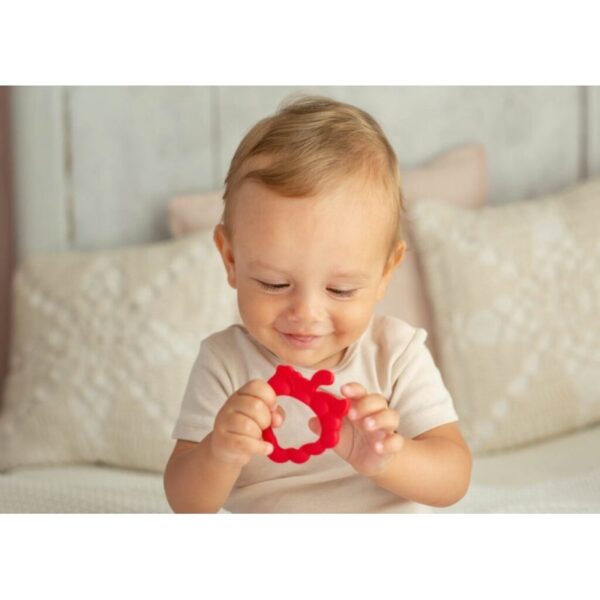 Silikonowy gryzak w formie koralikowej bransoletki z trzema zawieszkami: lwem, misiem i kotkiem. Każdy z doczepionych elementów różni się fakturą oraz kolorem. Zawieszki zdobią wypustki, które delikatnie masują obolałe dziąsła maluszka, przynoszą mu ulgę. Gryzaczek jest miękki i odporny na zgniatanie.