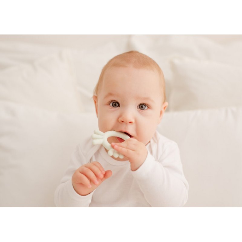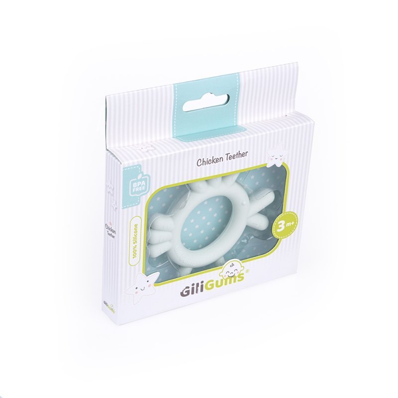 Silikonowy gryzak w kształcie kurczaka sprawdzi się idealnie u każdego ząbkującego maluszka. Jego zróżnicowana powierzchnia sprawia, że podczas gryzienia, delikatnie masuje on obolałe dziąsła dziecka. Kształt kurczaka jest idealnie dostosowany do małych rączek, co ułatwia jego chwytanie. Śliczny, pastelowy kolor czyni gryzak także stylowym dodatkiem dla każdego modnego bobasa.
