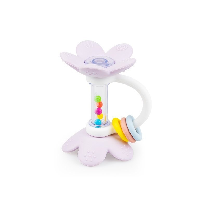 Grzechocząca zabawka w pastelowych odcieniach to przepis na odprężającą rozrywkę i ukojenie obolałych dziąseł! Urocze kwiatki z wypustkami na płatkach sprawdzą się świetnie w roli gryzaka, przynosząc ulgę ząbkującym maluchom. Pomiędzy kwiatkami znajduje się pionowa tuba wypełniona koralikami, które, przy potrząsaniu zabawką, wesoło grzechoczą. Praktyczny uchwyt, ozdobiony trzema ruchomymi kółeczkami, ułatwi małym rączkom chwytanie zabawki.