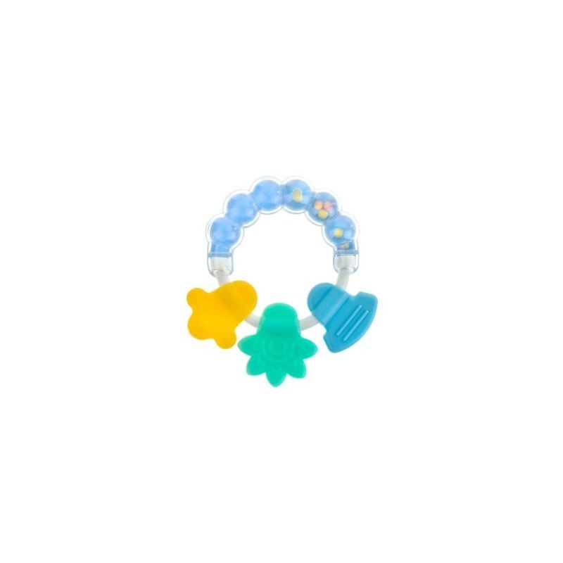 Grzechotka z gryzakiem łączy w sobie zalety gryzaka i grzechotki, gdyż pokryta jest gumową warstwą z wypustkami, niosącymi ulgę ząbkującemu maluchowi. Dzięki ciekawej kolorystyce wspomaga rozwój koordynacji wzrokowo-ruchowej dziecka. Specjalnie dobrany kształt sprawia, że grzechotka jest wygodna do uchwycenia i utrzymania w małych rączkach.