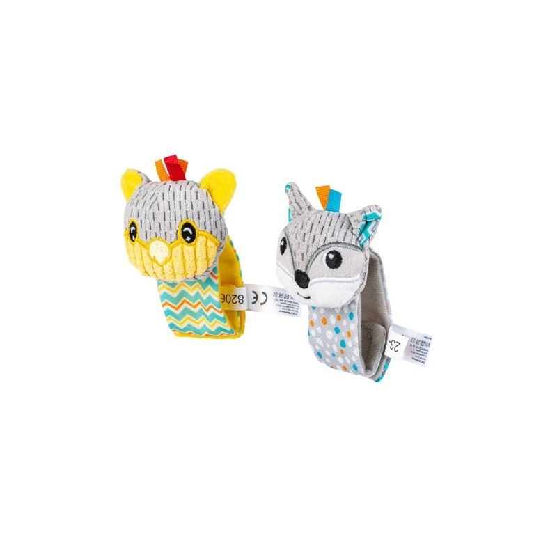 Grzechotanie na całego z parą obłędnie słodziutkich bransoletek! Obie grzechotki zapinane są na rzep, więc bez trudu można je zakładać i zdejmować z dziecięcych rączek. Jedną bransoletkę zdobi koala, a drugą szop, a z tego uroczego duetu można korzystać równocześnie lub oddzielnie, wybierając tę grzechotkę, którą w danym momencie maluszek interesuje się bardziej. Przy główkach zwierzaków znajdują się materiałowe mini metki, które stymulować będą zmysł dotyku bobasa, zachęcając go tym samym do sensorycznego odkrywania świata.