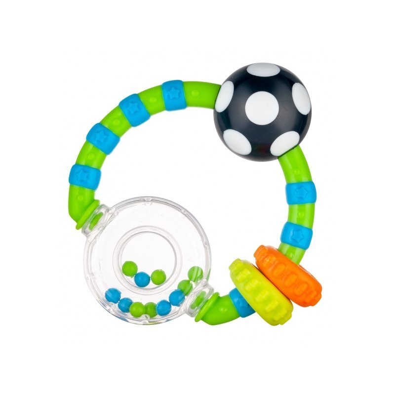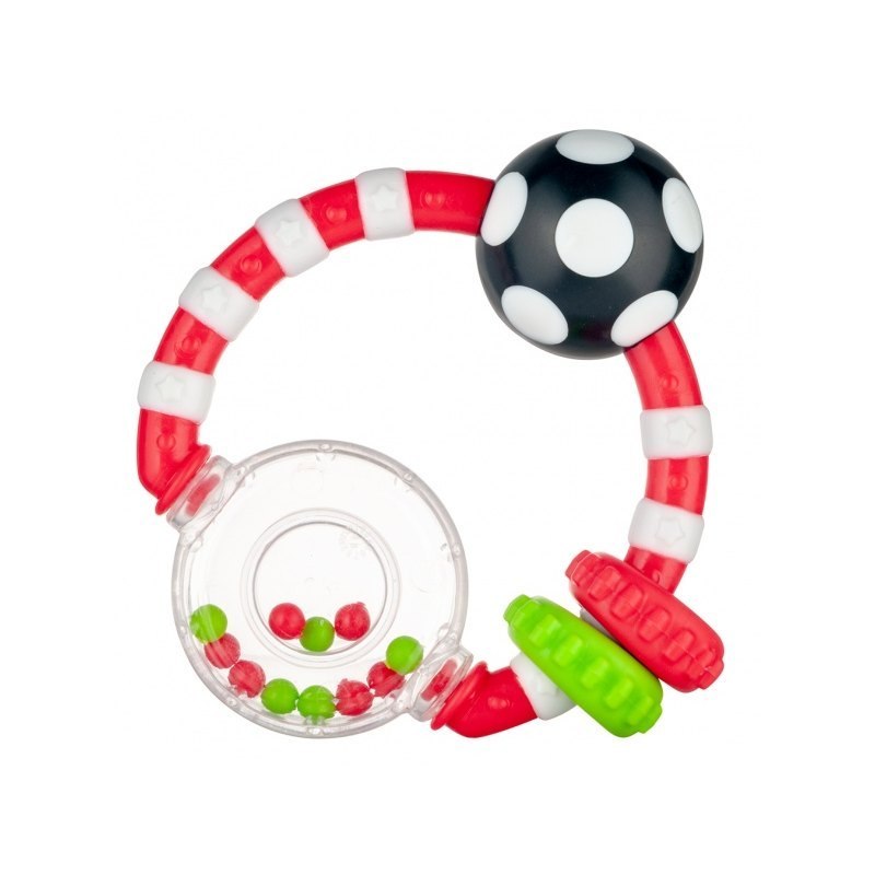 Przeznaczona dla najmłodszych dzieci łączy w sobie zalety gryzaczka elastycznego i grzechotki, gdyż posiadają miękkie części niosące ulgę ząbkującemu maluchowi. Obrotowe elementy i kontrastowe kolory zachęcają maluszka do ćwiczeń i zabawy, stymulując jego psychomotoryczny rozwój. Grzechotka z kolorowymi koralikami zaciekawi dziecko wprowadzając w świat dźwięku. Lekka i poręczna umożliwia wygodne trzymanie w małych rączkah