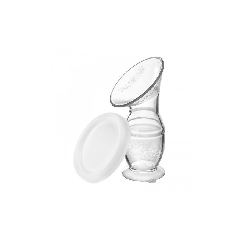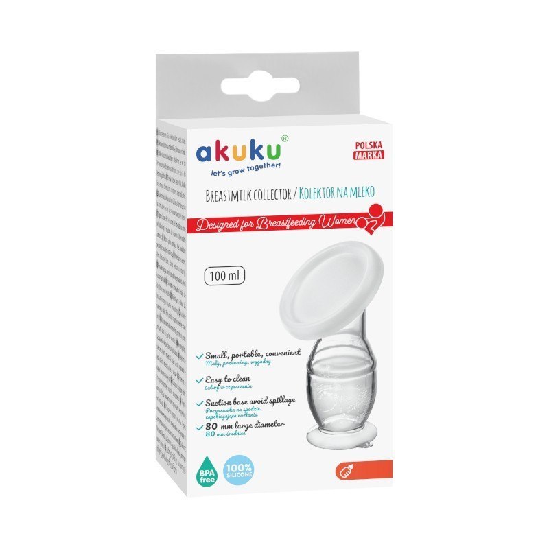 Silikonowy kolektor marki „akuku” pomaga karmiącym mamom zbierać mleko wyciekające z drugiej piersi podczas karmienia. Kiedy piersi są pełne mleka może również posłużyć jako odciągacz. Przy delikatnym ściśnięciu dolnej części kolektora i przyłożeniu lejka do piersi przysysa się do ciała i zbiera pokarm do zbiornika. Rowek na lejku ułatwia przelewanie do woreczka, aby zamrozić pokarm w razie potrzeby.