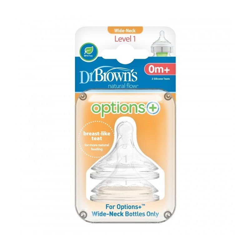 Smoczek pasuje do butelki Dr Brown s Options+ z szeroka szyjka. W opakowaniu znajdują się 2 smoczki.