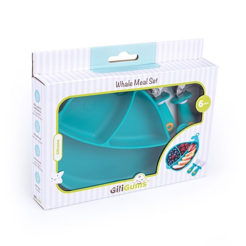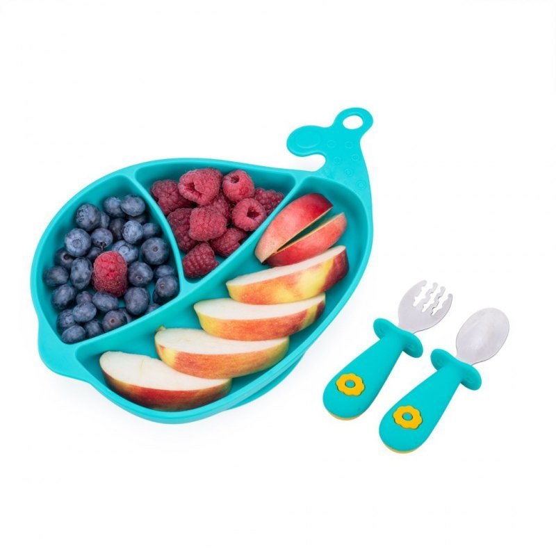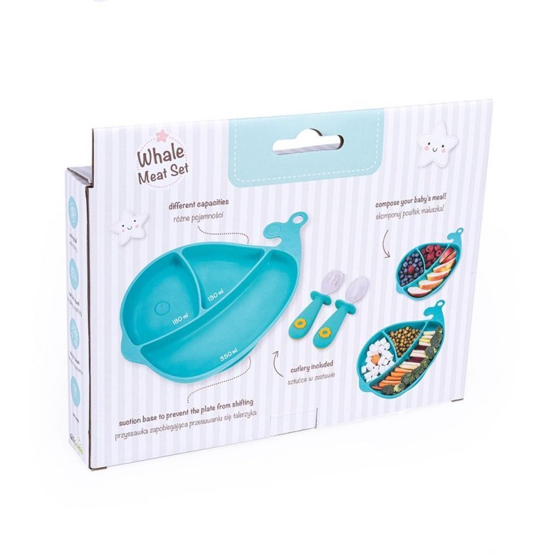 Praktyczny zestaw, który umili posiłki i zachęci najmłodszych do samodzielnego jedzenia! W jego skład wchodzi silikonowy talerzyk w kształcie wieloryba i komplet sztućców (widelec oraz łyżka), wykonanych ze stali nierdzewnej oraz silikonu. Każda z przegródek talerzyka ma inną pojemność, co pozwala na odpowiednie rozmieszczenie poszczególnych elementów posiłku. W postawie talerzyka znajduje się silikonowa przyssawka, która zapobiega przesuwaniu się talerza, ułatwiając tym samym maluchowi spożywanie posiłku. Sztućce wyposażone są w silikonowe uchwyty, które zapobiegają niekontrolowanemu wyślizgiwaniu się łyżki czy widelca z rączki.