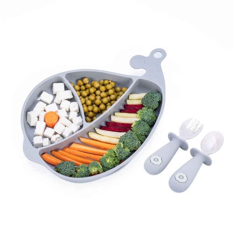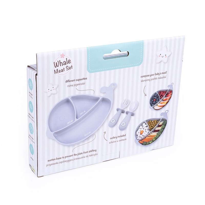 Z tym zestawem jedzenie posiłków zmieni się w smakowitą zabawę! W jego skład wchodzi silikonowy talerzyk w kształcie wieloryba i komplet sztućców (widelec oraz łyżka), wykonanych ze stali nierdzewnej oraz silikonu. Talerzyk posiada trzy przegródki, a każda z nich ma inną pojemność, co pozwala na odpowiednie rozmieszczenie poszczególnych elementów posiłku. W postawie talerzyka znajduje się silikonowa przyssawka, która zapobiega przesuwaniu się talerza, ułatwiając tym samym maluchowi samodzielne jedzenie. Sztućce wyposażone są w silikonowe uchwyty, które zapobiegają niekontrolowanemu wyślizgiwaniu się łyżki czy widelca z rączki.